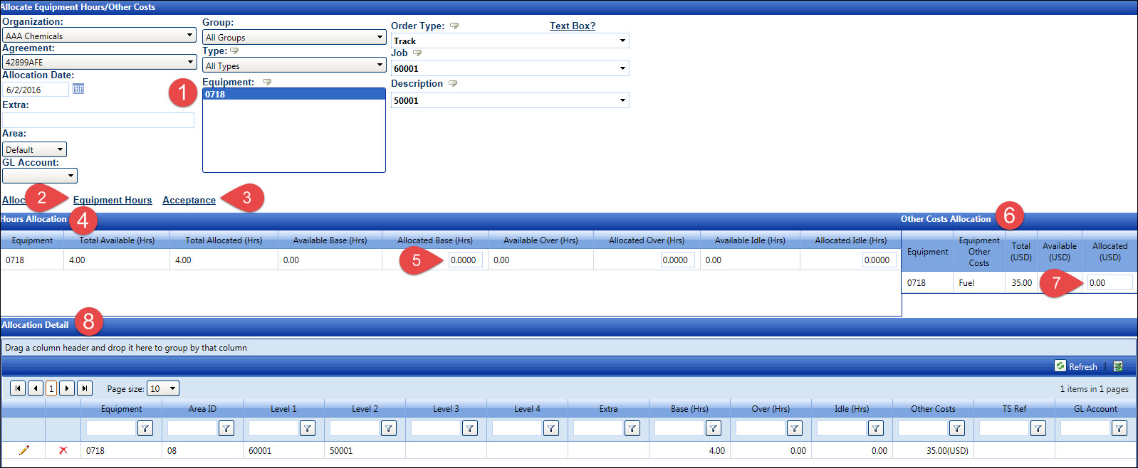 Click the Allocate link to allocate and display the allocated equipment hours and other costs in the Allocation Detail grid.