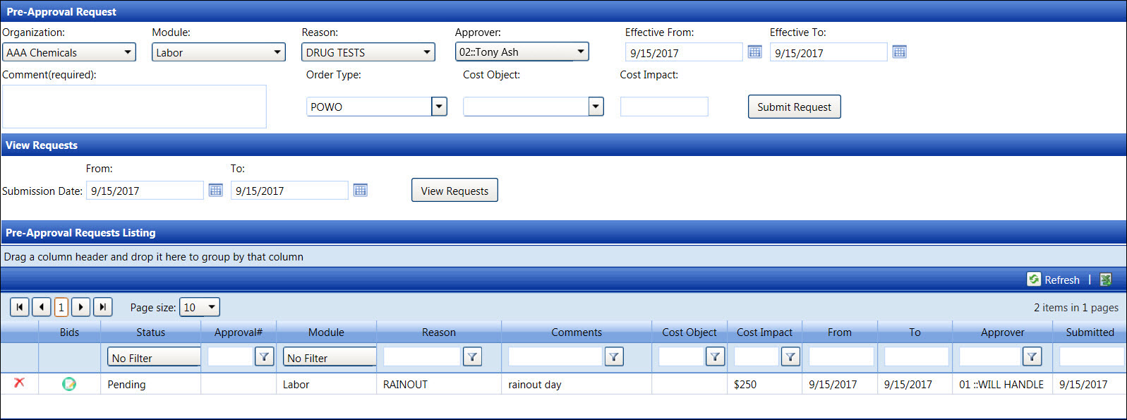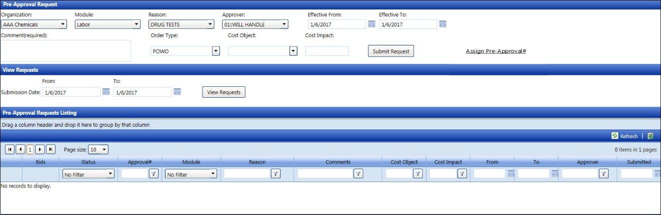 From the View Requests area, enter the pre-approval request submission date or date range into the To and From text boxes, or select the dates from the calendars.