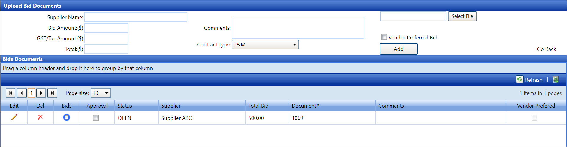 Users will have access to the bid documents feature according to the assigned profile rules. From the Upload Bid Documents screen, click the Go Back link to return to previous page.