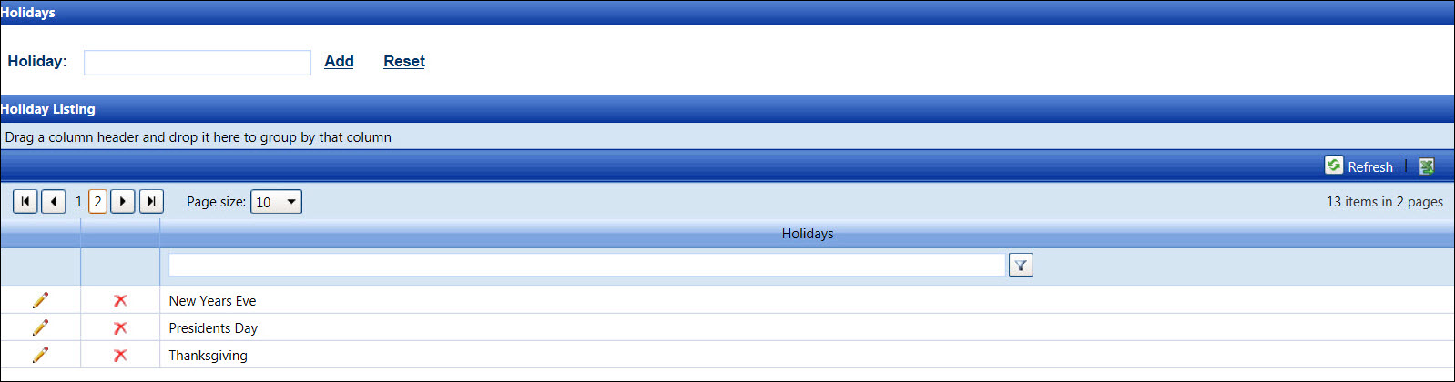 Since holidays may occur on different calendar dates each year, holidays must be set up each year for each organization.