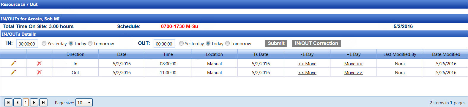 Click In/Out link to open the Resource In/Out screen, displaying the selected labor resource's event in the IN/OUTs Details grid.