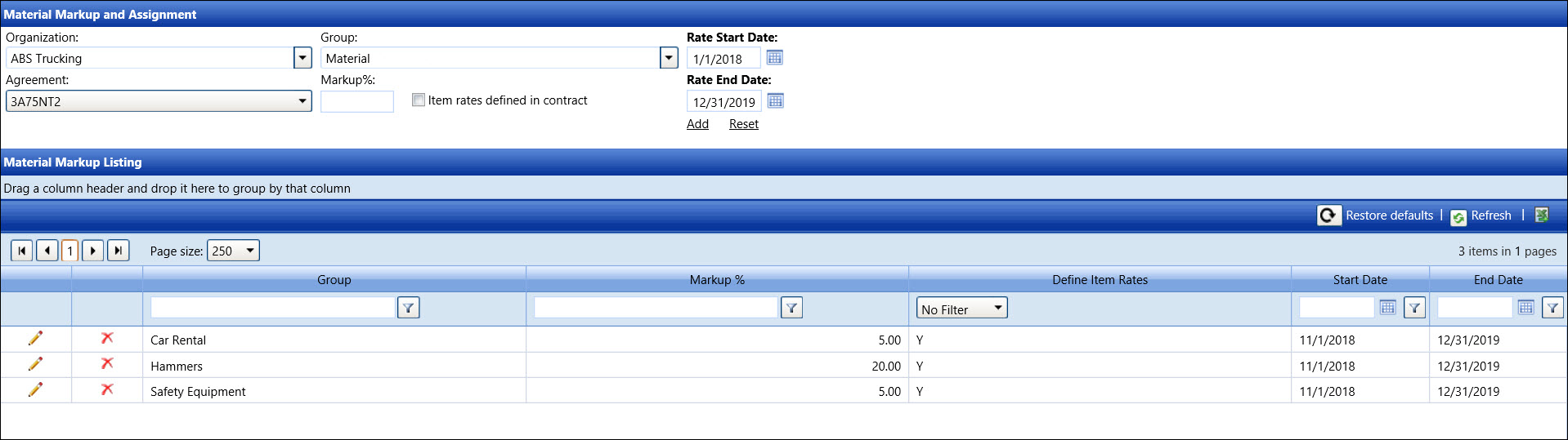 Adding materials to an existing agreement may include assigning material markup and item rates. For data integrity purposes, a material markup or an item rate that is in use cannot be deleted.