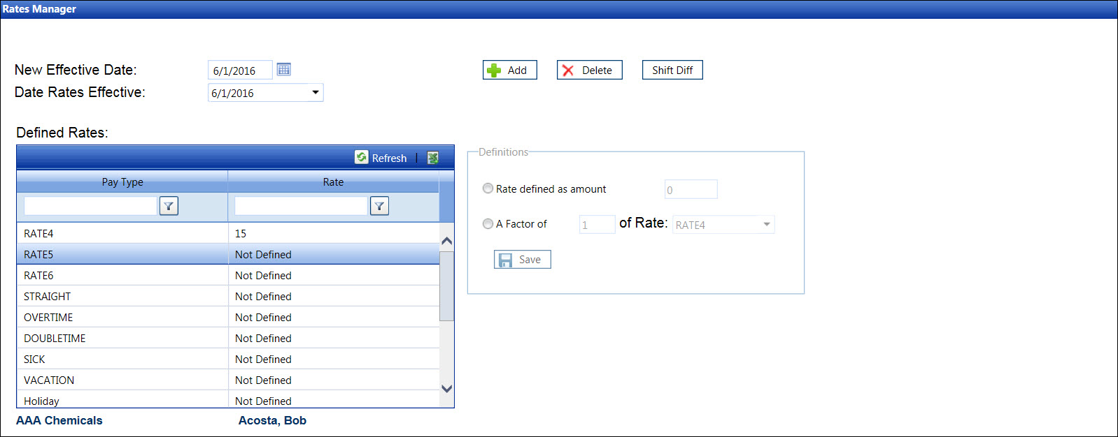 Click the Add button to save the effective date in the Date Rates Effective drop-down list. A list of pay types appear in the Defined Rates grid.