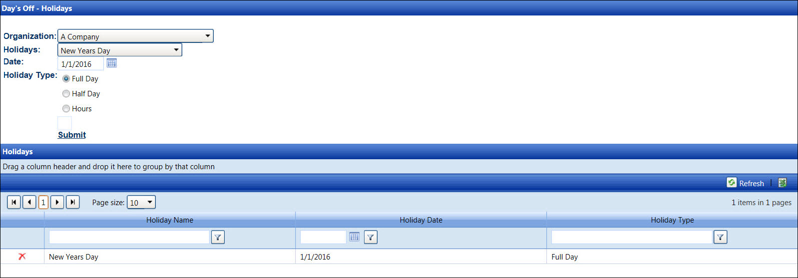 Click Submit to assign the holiday to the selected organization and display it in the Holidays grid.