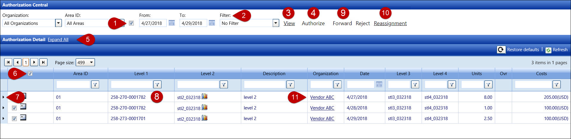 The Authorization Detail grid displays the available hours, costs, or charges that are ready for authorization. Click the Expand All link to display all line items in the Authorization Detail grid. After the Expand All link is selected, the option changes to Collapse All link.