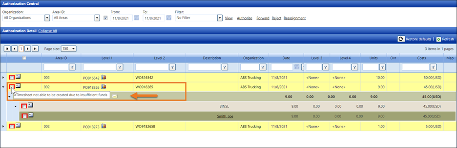 When the Enable authorization blocking for inactive Cost Objects option is enabled, and the cost objects have expired and/or are inactive, the red box will be displayed around the checkboxes at the Authorization Central screen for Authorization Central and Express Central. Hovering a mouse pointer over the checkbox at the Cost Object level will display the message, "Timesheet not able to be created due to closed/inactive Cost Object." These allocations pending authorizations line items will also display in yellow.